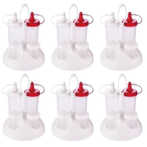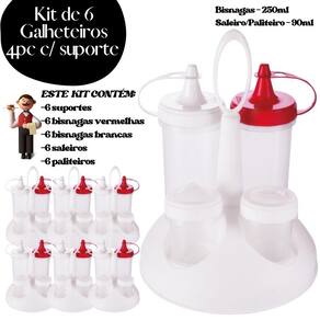 - Neste kit estão inclusos no total: 6 bases, 6 bisnagas de tampa vermelha, 6 bisnagas de tampa branca, 6 saleiros e 6 paliteiros.