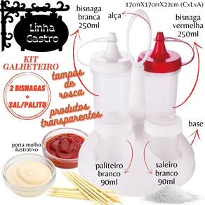 - Cada um dos galheteiros é composto por uma base elegante, duas bisnagas com capacidade para 250ml, um saleiro e um paliteiro com capacidade para 90ml, todos com tampa de rosca e fechamento firme, que impede incidentes e vazamentos e indesejados.
