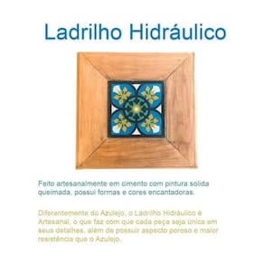 Possui no tampo, um ladrilho hidráulico feito artesanalmente em cimento com pintura solida queimada, possui desenhos e cores encantadoras. Diferentemente do Azulejo, o Ladrilho.