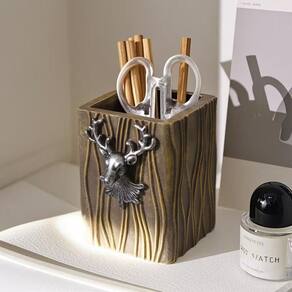 Material: vinil Tamanho: 8,6* 8,3* 11,4 cm Peso: 140 g Design elegante de cabeça de veado — Apresenta um toque prateado de cabeça de veado em um corpo texturizado de madeira, adicionando um estilo vintage europeu a qualquer mesa. Construção durável em vinil — Feita de vinil de alta qualidade, resistente e leve, garantindo um uso duradouro. Organizador multifuncional — perfeito como porta-canetas, porta-lápis ou pote para canetas, também adequado para tesouras, pincéis ou outros acessórios de mesa. Compacto e prático — Medindo 8,68,311,4 cm, este organizador de mesa mantém seus artigos de papelaria bem organizados sem ocupar muito espaço. Acessório de mesa decorativo — combina funcionalidade com charme rústico, tornando-o um complemento ideal para mesas de escritório, estudos ou decoração de casa.