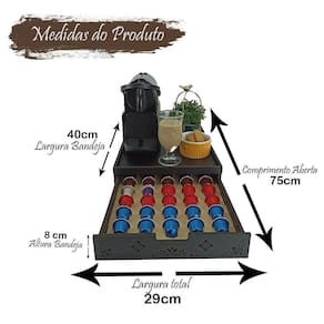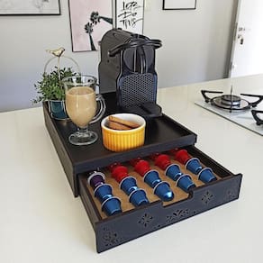 Porta cápsulas Nespresso com Bandeja Para 45 capsulas café Monte hoje mesmo seu cantinho do café com nossa bandeja compacta... Este é o produto ideal para você Nossa bandeja é feita em MDF bi-laminado de alta qualidade;Possui espaço para sua cafeteira e também xícaras na parte superior.Além disso, possui uma gaveta, com capacidade para 45 cápsulas. Nada melhor que uma peça que te faça otimizar espaço, e que também suporte às suas necessidades, de uma maneira que facilite para o seu dia-dia. Esta peça tem todas essas qualidades e vai deixar o seu cantinho do café ainda mais aconchegante. Dimensões: Altura total da bandeja: 8cmComprimento: 40cmLargura: 29 cm Capacidade para 45 cápsulas NespressoOBS: Cápsulas e acessórios não acompanham o produto