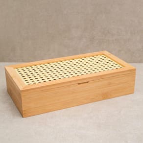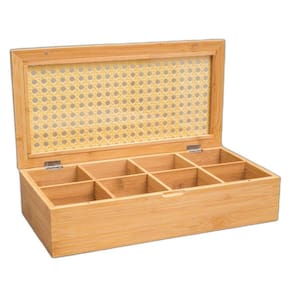 Porta chá de bambu Palhinha 8 divisórias da OIKOS.Ideal para guardar chás, especiarias para gin, acompanhamentos para a hora do cafezinho, doces, bijuterias e maisCom 8 divisórias que permitem separar e organizar melhor os objetos.O detalhe da palha e a cor natural são atemporais e combinam com diversos estilos de decoração, deixando o ambiente mais charmoso e rústico.Feita de bambu, material leve e ecologicamente correto.O bambu é resistente e tem propriedades que evitam a proliferação de bactérias, só precisa lavar e secar de acordo com as recomendações. Possui 2 imãs para melhor fechar a tampa. Características do Produto:Material: bambu, Acrílico e PalhinhaDimensões: 32 comp x16,5 larg x 7,5 prof