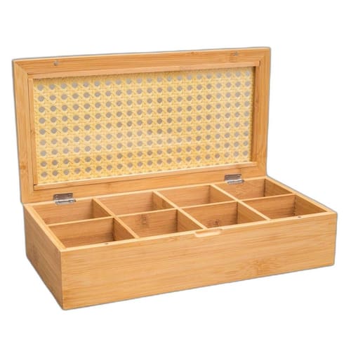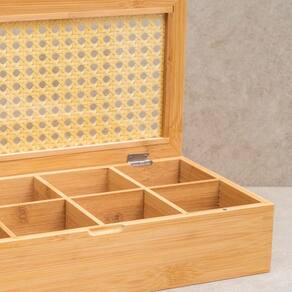 Ideal para guardar chás, especiarias para gin, acompanhamentos para a hora do cafezinho, doces, bijuterias e mais Com 8 divisórias que permitem separar e organizar melhor os objetos. O detalhe da palha e a cor natural são atemporais e combinam com diversos estilos de decoração, deixando o ambiente mais charmoso e rústico. Feita de bambu, material leve e ecologicamente correto. O bambu é resistente e tem propriedades que evitam a proliferação de bactérias, só precisa lavar e secar de acordo com as recomendações. Possui 2 imãs para melhor fechar a tampa.