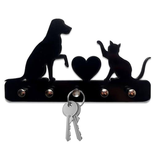 Porta Chaves Amor Cachorro e Gato Decoração Criativa Cor: Preto O Porta Chaves Amor Cachorro e Gato é excelente para uma decoração criativa, divertida e ideal para aqueles pais de pets que se amam mesmo entre patadas e lambeijos. Criatividade até na hora de organizar as suas chaves. Características: Possui 5 pinos para chaves. Dimensões: 19,512,5 cm Material: feito de PSI 2mm, material semelhante a acrílico, cortado a laser, adesivado especial Conservação: Pano macio úmido com água e sabão neutro Fixação: Adesivo dupla face para aplicação em qualquer tipo de superfície lisa. Acompanha fita dupla face para fixação à parede. Marca: Geek Vip Ean: 7898711272785