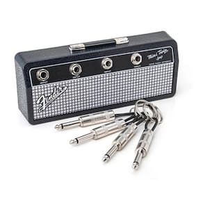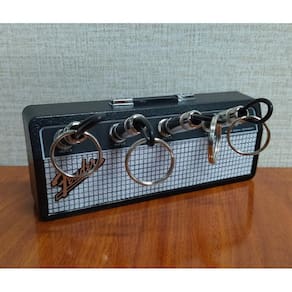 Porta Chaves Chaveiro Amplificador Fender Com 4 Plugs P10 Ele tem um acabamento brilhante, com materiais reais de amplificadores, 4 chaveiros de plug P10 de guitarra e um kit para prendê-la na parede para te ajudar a pendurar suas chaves como um rockstar