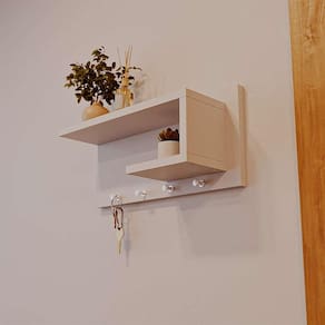O produto possui 4 pinos para pendurar chaves e espaço para guardar objetos pessoais e decorativos, tornando-o um produto versátil e prático para o uso no dia a dia.