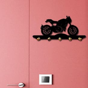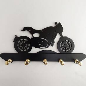 Decore sua casa ou presenteie seus amigos. Lindo Porta Chaves Fabricado com Mdf de 1a. qualidade sua pintura é a mesma utilizada em automóveis com aplicação de primer, lixamento e aplicação de tinta Laca automotiva na cor clássica preto Cadillac com acabamento acetinado. MDF de 3 mm e 6mm na base do suporte dos pinos. Produto resistente, leve e de fácil instalação. Especificações Técnicas: Medidas: comprimento: 22 cm altura: 2 cm largura: 11 cm Material: mdf 3mm Cor: preto Tema: moto Formas de instalação: basta utilizar fitas dupla face Quantidade: 1 unidade Características específicas: pinos dourados com acabamento