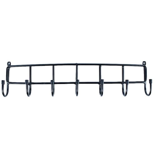 Especificações Material: aço Cor: preto fosco Ganchos: 7 hastes Comprimento: 33cm Espaço entre hastes: 5cm Altura: 7cm Peso suportado: 3kg aguenta até mais, mas recomendamos não forçar os parafusos Marca: Não Informado Ean: 7798562467098