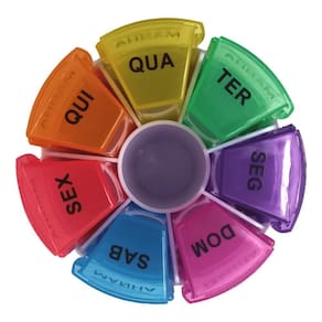 Porta comprimidos organizador semanal 4x/dia bic bem estar O porta comprimidos organizador semanal 4x/dia bic bem estar ajuda você a organizar seus medicamentos e vitaminas no dia-a-dia. São 7 bandejas portáteis dentro da caixa de cápsulas, uma para cada dia da semana, e separação para os períodos da manhã, tarde, noite, e cama. Possui design moderno e colorido. Auxilia a lembrar de tomar os medicamentos e vitaminas. Características gerais::: auxiliar na organização de medicamentos e vitaminas;:: material resistente e colorido;::7 bandejas, uma para cada dia da semana. Cada bandeja é ainda subdividida para medicação em 4 períodos distintos: manhã, tarde, noite, cama. Dados técnicos::: material: material plástico copoliéster tritan de alta durabilidade:: tamanho do produto: 9,5 x 8,5:: peso: 190g:: cor: branco, azul, rosa, roxo, verde, amarelo, laranja, vermelho:: limpeza/desinfecção: não utilizar produtos de limpeza que contenham cloro ou alvejante. Limpar com esponja ou pano não abrasivo.:: recomendações: transporte em segurança, evite quedas ou batidas. Feche bem o compartimento para garantir um fechamento seguro. Mantenha longe do alcance de crianças.Garantia: 90 dias contra defeitos de fabricação Peso e medidas da embalagem:Peso: 250gComprimento: 24cmAltura:10cmLargura:15cm Conteúdo da embalagem::: 01 unidade do porta comprimidos organizador semanal 4x/dia bic bem estar Marca: Bic Bem Estar
