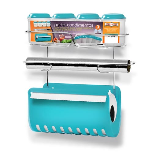 Chegou mais uma praticidade para sua casa, o belo Porta Rolo duplo com porta condimentos Feito em plástico com aço cromado de muita qualidade e brilho, é um produto resistente e durável, ideal para prender à parede e acomodar, além do papel toalha, plástico transparente ou papel alumínio e condimentos que são utensílios que toda dona de casa precisar ter. É ideal para ajudar na organização da cozinha com muita beleza e praticidade Medidas: 30 X 34 X 13 Acompanha kit bucha + ventosas
