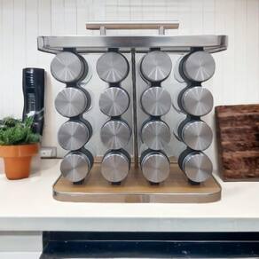 1. Quantos potinhos acompanham o porta condimentos? R: Esse porta condimentos acompanha 16 potes de vidro com tampa inox.