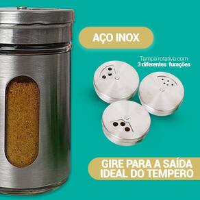 Ideal para manter sua bancada organizada, linda, moderna e conservar seus temperos por mais tempo através da vedação de sua tampa. Torna o dia a dia prático em sua cozinha, com seus condimentos e utensílios próximos à mão, podendo armazená-los de forma correta e em um mesmo local. Vantagens do produto: - Tampa rotativa - 3 diferentes furações - Ideal para qualquer tempero - Prático Medidas: 4,8cm diâmetro x 8,2cm altura Composição: Aço Inox e Vidro Capacidade: 80ml Contém: 1