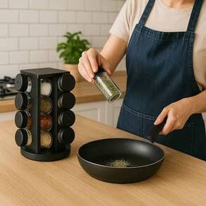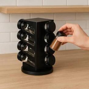 Compacto e prático, este porta condimentos mantém tudo à mão, organizando sua cozinha com eficiência e um toque de sofisticação. ===================================== Contém: 01 Porta Temperos 08 Potes