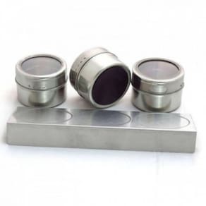 Dimensões: Suporte Retangular:20,7cm x 7cm x 2,7cm Potes: 4,5cm x 6,5cm Material: Aço inox Itens inclusos 01 Suporte Retangular 03 Potes Magnéticos Marca: Não Informado