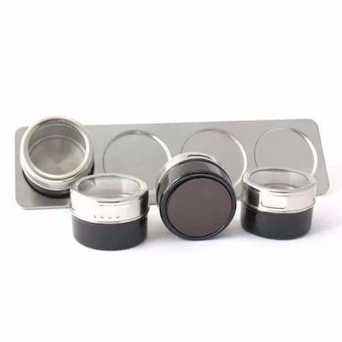 porta condimentos magnético fabricado em aço inox, combina muito bem com as cozinhas mais modernas com bastante inox. Você pode expor todos os seus temperos favoritos organizados na geladeira, facilitando na hora de cozinhar e dando um toque gourmet na cozinha ou colocando todos na base inclusa. Possui duas aberturas, com furinhos para pequenas quantidades e abertura total uns 2 cm de abertura para grandes quantidades , tampa com visor transparente em plástico resistente e imã na base. Outra função sugerida pelo fabricante é para organizar materiais de escritório como clipes, tachinhas, grampos. Use a criatividade!