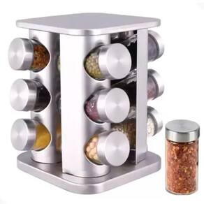 - Material: Aço Inox e Vidro - Base giratória - 12 potes com capacidade de 80 gramas cada - Dimensões Gerais: 22cm Altura x 18cm Largura x 18cm Profundidade - Dimensões do Pote: 9,5cm Altura x 4cm Diâmetro - Peso Total: 2.300 Kg - Tamanho da Embalagem: 23x19x19cm