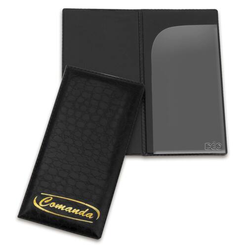 Ideal para Restaurantes, lanchonetes, bares, padarias e cafeterias , produto de ótima qualidade e bonito pata o seu negócio Porta Comanda / conta para Restaurantes kit com 10 unidades - Gravação Dourada - Almofadada - Espuma 3mm - PVC 0,15 - medidas 85 mm x 175 mm - Cor preto - Peso unitário 120 gramas A Marca: Não Informado Ean: 7898026780425