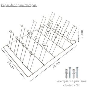 Material: Aço cromado Revestimento Externo: Cromado Marca: Alpif Capacidade: até 20 copos Tamanho: 28cm Comprimento x 13cm Largura x 42 Altura
