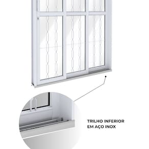Possui duas folhas móveis e uma fixa, com grade mosaico que valoriza o visual do ambiente sem abrir mão da proteção. O vidro liso de 0,4cm permite ampla entrada de luz natural, garantindo leveza e conforto visual.