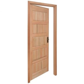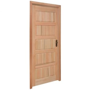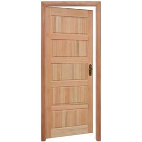Porta montada de 5 almofadas horizontais. Composta por: 1 folha de porta, marco, guarnições para um lado, dobradiças e fechadura. Marco simples. Fechadura Alavanca Stam. Porta de dobradiças. Produto pronto para instalação.