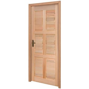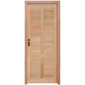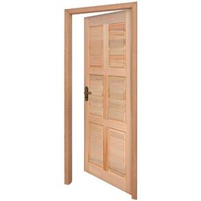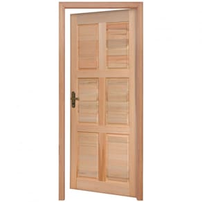 Porta montada de 6 almofadas verticais. Composta por: 1 folha de porta, marco, guarnições para um lado, dobradiças e fechadura. Marco simples. Fechadura Alavanca Stam. Porta de dobradiças. Produto pronto para instalação.