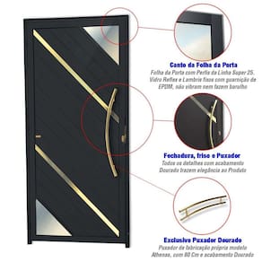 Portas de Abrir de Alumínio, Linha Super 25, Pintura Eletrostática Preta, 1 Folha de Abrir para o Lado Direito, Vidro Reflex Champanhe 3mm, Lambris Diagonais com 2 Frisos Diagonais Polidos, Dourados e Envernizados, Puxador Athenas 80 Cm Polido Dourado, Altura 210 Cm, Largura 100 Cm, Requadro 4,6 Cm, Garantia de 5 anos contra defeitos de fabricação. Ambientes Recomendados: Externo Acompanha Batedor: Sim Acompanha Batente: Sim Acompanha Fechadura: Sim Acompanha Guarnição: Não Acompanha Manual de Instalação: Sim Acompanha Trinco: Não Altura: 210 Ambiente Principal: Sala de Estar Cor: Preto Dourado Cor do Batente: Preto Cor do Produto: Preto Dourado Cor do Vidro: Marrom Escala de Brilho: Fosco Espessura: 4.6 Espessura do Vidro: 3 Isolamento Acústico: Não Itens Inclusos: 1 Porta completa montada com Fechadura, Dobradiças e embalagem protetora. Acompanha Puxador Lado de abertura: Direita Largura: 100 Largura do Batente: 4.6 Linha ou Coleção: Super 25 Manual de Montagem e Instalação: https://product-hub-prd.madeiramadeira.com.br/869653/documents/5766fd51-cfde-46d3-b30e-cceddee3e36582manualesquadriasaluminio.pdf Material da Dobradiça: Alumínio Material do Batente: Alumínio Material do Puxador: Alumínio Necessita Montagem: Não Origem do Produto: Nacional Peso: 30.79 Possui Grade: Não Tamanho: 210cm x 100cm Tipo de Dobradiça: Simples Tipo de Parede: Alvenaria Tipo de Porta: Abrir Tipo de Puxador: Externo Tipo de Vidro: Controle Solar Vidro incluso: Sim