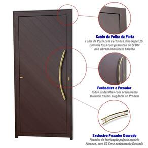 Apresentamos Porta de Alumínio da Linha Super 25, com uma sofisticada pintura eletrostática na cor Corten. Esta porta possui uma única folha que abre para o lado esquerdo, proporcionando um design elegante e funcional. O destaque fica por conta dos lambris dispostos em diagonal, que adicionam um toque de requinte ao conjunto. A porta é complementada por um puxador Athenas de 80 cm, polido e dourado, que harmoniza perfeitamente com os lambris. As dimensões da porta são de 210 cm de altura e 90 cm de largura, com um requadro de 4,6 cm, tornando-a uma opção robusta e imponente para a sua entrada. Além disso, oferecemos uma garantia de 5 anos contra defeitos de fabricação, assegurando a sua tranquilidade e satisfação com o produto. Ambientes Recomendados: Externo Acabamento do Puxador: Polido Acompanha Batedor: Sim Acompanha Batente: Sim Acompanha Fechadura: Sim Acompanha Guarnição: Não Acompanha Manual de Instalação: Sim Acompanha Trinco: Não Altura: 210 cm codigo_ean: 7898721693624 Cor: Marrom Corten Dourado Cor do Batente: Marrom Cor do Produto: Marrom Corten Dourado Escala de Brilho: Fosco Espessura: 4,6 cm Isolamento Acústico: Não Itens Inclusos: 1 Porta completa montada com Fechadura, Dobradiças e embalagem protetora. Acompanha Puxador Lado de abertura: Esquerda Largura: 90 cm Largura do Batente: 4,6 cm Linha ou Coleção: Super 25 Manual de Montagem e Instalação: https://product-hub-prd.madeiramadeira.com.br/869561/documents/b0238d0e-092e-4fdf-b5d2-3b4686ffc02101manualesquadriasaluminio.pdf Material da Dobradiça: Alumínio Material do Batente: Alumínio Material do Puxador: Aço Material Principal: Alumínio Necessita Montagem: Não Origem do Produto: Nacional Peso: 27 kg Possui Grade: Não Tamanho: 210cm x 90cm Tamanho do Produto: 210cm x 90cm Tipo de Dobradiça: Simples Tipo de Parede: Alvenaria Tipo de Porta: Abrir Tipo de Puxador: Externo Vidro incluso: Não