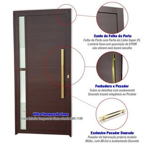 Apresentamos as Portas de Abrir da Linha Super 25, fabricadas em Alumínio e com uma distinta Pintura Eletrostática na cor Corten. Cada porta tem uma única folha que abre para o lado esquerdo e é complementada por um Vidro Inferior Liso Incolor de 5mm, Temperado para maior resistência. O Puxador Milão, com 80 cm de comprimento e acabamento polido dourado, adiciona um toque de requinte. As dimensões da porta são de 210 cm de altura e 90 cm de largura, com um requadro de 4,6 cm. Para sua total confiança, oferecemos uma garantia de 5 anos contra defeitos de fabricação. Vidro: Temperado Ambientes Recomendados: Externo Acabamento do Puxador: Polido Acompanha Batedor: Sim Acompanha Batente: Sim Acompanha Fechadura: Sim Acompanha Guarnição: Não Acompanha Manual de Instalação: Sim Acompanha Puxador: 01 Acompanha Trinco: Não Altura: 210 cm codigo_ean: 7898721693709 Cor: Marrom Corten Dourado Cor do Batente: Marrom Cor do Produto: Marrom Corten Dourado Elétrica: Não Escala de Brilho: Fosco Espessura: 4,6 cm Espessura do Vidro: 5 mm Isolamento Acústico: Não Itens Inclusos: 1 Porta completa montada com Fechadura, Dobradiças e embalagem protetora. Acompanha Puxador Lado de abertura: Esquerda Largura: 90 cm Largura do Batente: 4,6 cm Linha ou Coleção: Super 25 Manual de Montagem e Instalação: https://product-hub-prd.madeiramadeira.com.br/869566/documents/a5777548-a7d4-42ce-879e-f5666bbc7d7225manualesquadriasaluminio.pdf Material da Dobradiça: Alumínio Material do Batente: Alumínio Material do Puxador: Aço Material Principal: Alumínio Necessita Montagem: Não Número de Folhas: 01 Origem do Produto: Nacional Peso: 26,77 kg Possui Grade: Não Recomendações de Uso, Manutenção e Limpeza: Utilizar Pano úmido e sabão neutro Tamanho: 210cm x 90cm Tamanho do Produto: 210cm x 90cm Textura da Porta: Lisa Tipo de Dobradiça: Simples Tipo de Parede: Alvenaria Tipo de Porta: Abrir Tipo de Puxador: Externo Tipo de Vidro: Temperado Vidro incluso: Sim