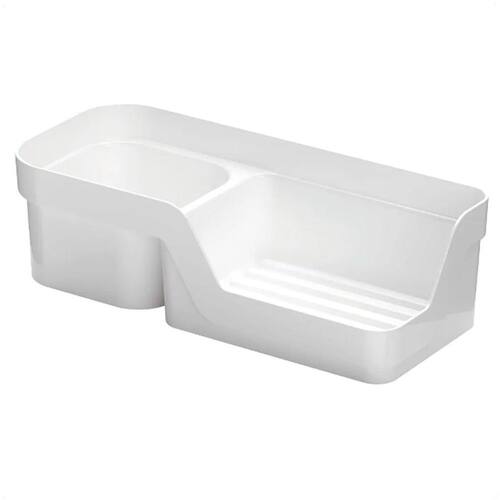 Organizador de pia com compartimentos para detergente e esponja. Material de plástico resistente. Design moderno na cor branca, harmonizando com diversos ambientes como cozinha, lavanderia e banheiro. Ideal para organização de pia em diferentes espaços.