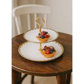 Elegante e funcional, ele traz dois andares em porcelana branca com detalhes em dourado, perfeito para apresentar doces, mini sobremesas, frutas ou petiscos com charme. A estrutura é resistente, fácil de montar e ideal para compor mesas postas, aniversários, cafés especiais e recepções.
