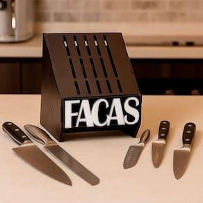 Porta facas em MDF com acabamento clean e letreiro em acrílico prata com a inscrição Facas. Suporta até 14 facas de variados tamanhos, incluindo cutelos e facas padrão. Design funcional e resistente, ideal para cozinha e estabelecimentos.