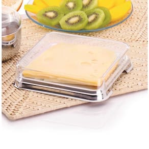 Composição do produto: 1 Prato em Inox 15,5x15,5x1,4cm 1 Tampa em ps incolor 14,7x14,7x3,5cm