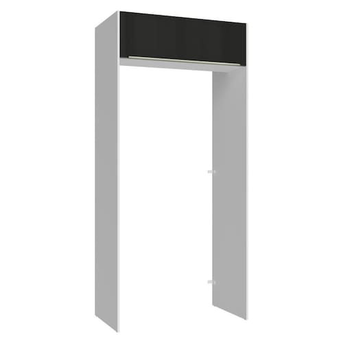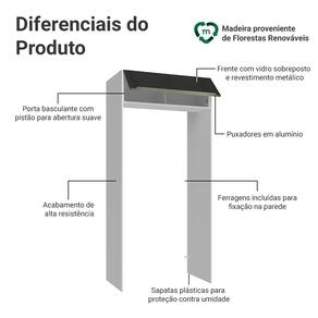 A porta basculante, equipada com pistão a gás, mantém-se suspensa quando aberta, oferecendo mais segurança e praticidade no uso diário. O acabamento branco com preto, aliado às portas com vidro sobreposto, resulta em uma composição marcante e elegante, perfeita para cozinhas modernas e cheias de personalidade.