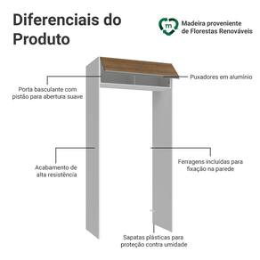 O acabamento branco com amadeirado Rustic une leveza e aconchego. A porta basculante, equipada com pistão a gás, mantém-se suspensa quando aberta, oferecendo praticidade e maior segurança no dia a dia.