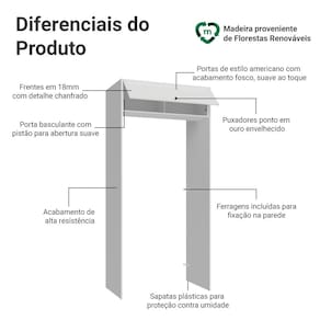 O acabamento do móvel conta com textura suave ao toque, que valoriza o visual sofisticado da linha. O tom branco traz leveza e luminosidade ao ambiente. A porta basculante com sistema de pistão a gás mantém a porta suspensa quando aberta, proporcionando mais praticidade e segurança para o uso diário.