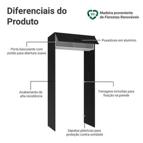 A combinação de preto com branco resulta em um visual marcante e sofisticado, ideal para cozinhas com proposta moderna. A porta basculante, equipada com pistão a gás, proporciona mais praticidade e segurança, permanecendo suspensa quando aberta.