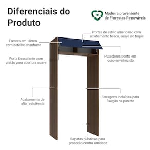 O acabamento do móvel conta com textura suave ao toque, que valoriza o visual sofisticado da linha. A combinação de amadeirado Rustic da estrutura com a porta azul cria um ambiente repleto de personalidade. A porta basculante com sistema de pistão a gás mantém a porta suspensa quando aberta, proporcionando mais praticidade e segurança para o uso diário.