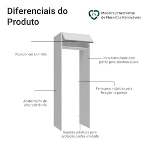 A porta basculante possui sistema de pistão a gás, que a mantém suspensa quando aberta, garantindo ainda mais segurança no dia a dia. O acabamento é no tom branco, os puxadores no tom cinza, em perfil de alumínio no estilo cava, garantem um acabamento sofisticado e discreto, além de facilitarem o uso diário.