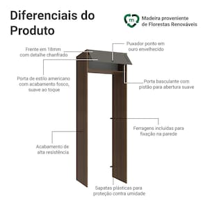 A porta basculante possui sistema de pistão a gás, que a mantém suspensa quando aberta, garantindo ainda mais segurança no dia a dia. O acabamento de alta resistência na combinação de amadeirado Rustic com Cinza possui textura suave ao toque, resultando em um visual sofisticado.