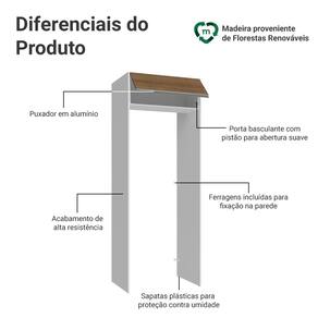 O acabamento branco com amadeirado Rustic une leveza e aconchego. A porta basculante conta com sistema de pistão a gás, que a mantém suspensa quando aberta, garantindo mais praticidade e segurança no uso diário.