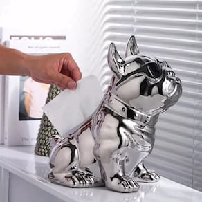 Adicione um pouco de personalidade e glamour à sua mesa com este elegante e divertido porta-guardanapo em forma de bulldog, disponível nas sofisticadas cores prata e dourado.