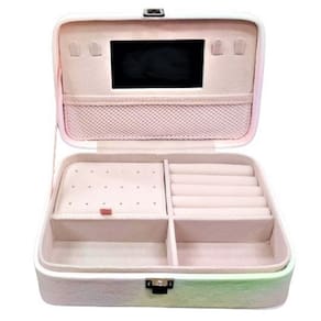 Porta Joia de Couro Sintético Este porta joia é um charme, perfeito para armazenar seus anéis, brincos, pulseiras, colares e pequenos acessórios. Possui um espelho interno embutido, para maquiagem. Ótimo presente para esposas, namoradas e familiares. Ideal para viagens e decoração, este porta joia é compacto e prático, e tem fechamento com trava. Protege suas joias e bijuterias de poeira, arranhões. Feito de material de ótima qualidade e resistente.
