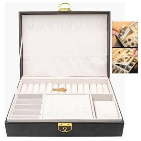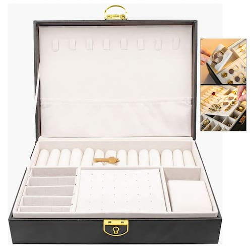 Armazenamento interno personalizável: múltiplos compartimentos separados com divisórias removíveis para acomodar joias de diferentes tamanhos e formatos.