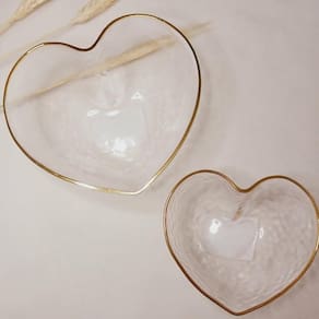Descubra a elegância e a beleza dessa dupla porta-joias em forma de coração, adornada com uma sofisticada borda dourada. Perfeitas para organizar seus acessórios preciosos ou para servir petiscos e frutas à mesa, essas peças versáteis trazem um toque especial a qualquer ocasião.