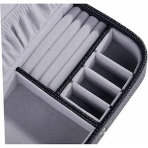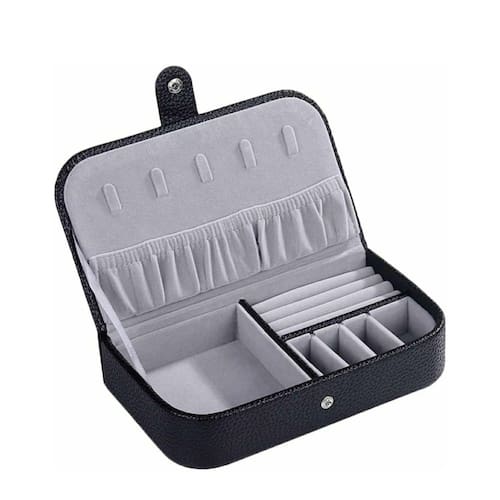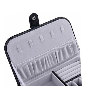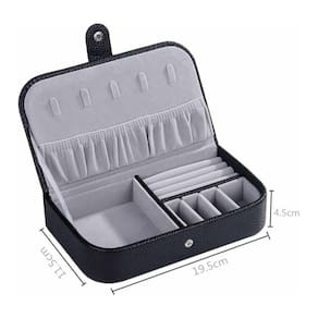 Características - tamanho: cerca de 19.5 x 11.5 x 4,5cm . - material: Couro sintático - prático e moderno: esta pequena caixa de joias é um presente atencioso para festa de casamento, festa de aniversário para bandeja de pulseira participantes. - cor: Externo -Preto/ Interno Veludo Cinza - melhor para guardar pequenas joias de uso diário e mantê-las organizadas ao lado da cama antes de dormir, estojo de viagem cosmético. - mantenha todas as suas joias amadas bem organizadas. - principal utilizado para pequenos enfeites como anéis, brincos, tachas, pingentes, abotoaduras; também pode colocar pequenos cosméticos como batom ou relógios depois de retirar o compartimento brincos de couro.