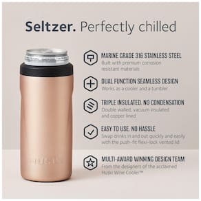 MANTENHA SUA BEBIDA PERFEITAMENTE REFRIGERADA Isolamento triplo para desempenho térmico máximo. Paredes duplas, isoladas a vácuo e revestidas em cobre. Os resfriadores Huski Selzter são construídos para durar com aço inoxidável 316 marinho resistente à corrosão.