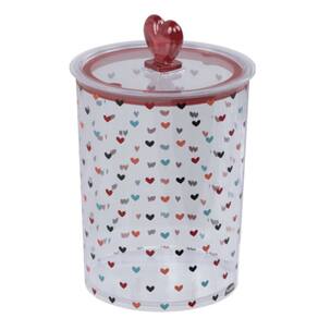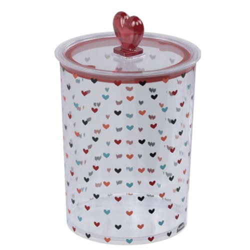 Pote Hermético 500ml redondo, transparente com decoração e tampa com puxador, com decoração predominante de corações e filete emborrachado de vedação interna na cor vermelha.