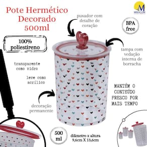 Este pote de 500ml auxilia no armazenamento de mantimentos, doces, biscoitos e tudo aquilo que se pretende armazenar com a certeza de manter seu conteúdo fresco ainda por mais tempo, já que conta com uma vedação interna de borracha na tampa, que protege os alimentos da ação do ambiente externo. O pote conta com um recipiente único generoso, com base interna lisa e oferece espaço necessário para acomodar conteúdos menos volumosos. A tampa conta com um delicado puxador em formato de coração vermelho.