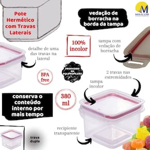 Pote plástico com capacidade para 380 ml. Possui silicone na tampa e travas laterais para uma melhor vedação e conservação do alimento. Produzido em material atóxico e livre de BPA. Pode ser levado ao freezer e ao micro-ondas. Diferenciais: - Modular e Empilhável: otimiza espaço em seu armário. - Tampa transparente: ótima organização em gavetas. - Vedação com borracha: vida longa aos alimentos. - Travas de fechamento: segurança ao fechar e abrir. - Livre de bisfenol-A (BPA FREE). Material: polipropileno e tampa com silicone Capacidade: 0,38 litros Comprimento: 11,0 cm / Largura: 10,4 cm / Altura: 7,6 cm Marca: Não Informado