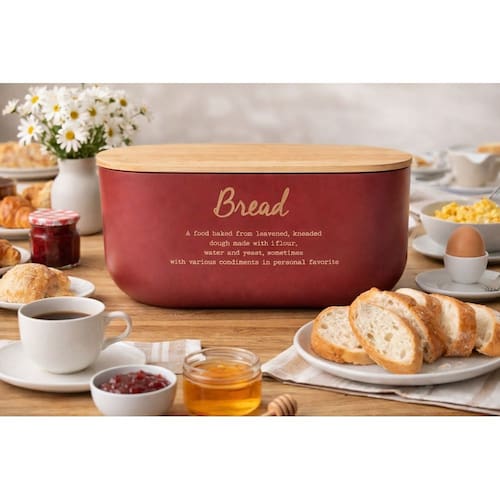 A estrutura em metal resistente garante durabilidade no uso diário, enquanto a tampa em bambu com excelente vedação ajuda a preservar a textura e o frescor dos alimentos por mais tempo. O tom vermelho carmim adiciona personalidade e sofisticação à bancada, tornando o porta pão um verdadeiro destaque decorativo. Perfeito para quem valoriza detalhes que fazem a diferença.